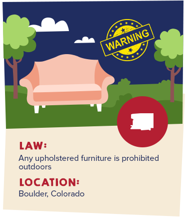 Couches, chairs, mattresses, chaise lounges—you name it. You cannot have any upholstered furniture, or any furniture not manufactured for outdoor use, in the yard or on the porch of your home in Boulder. The restriction was passed to curb the dangers of setting those things on fire. It is because local college students, who were known for their party atmosphere, would get drunk and had a habit of setting fires to the said couches. Since passing in Boulder, many other cities, such as Ames, Iowa, Lincoln, Nebraska, and Columbia, Missouri, decided to pass a similar law. Now, if you're looking to live the outdoor life of your dreams in any of these cities, you wouldn’t mind the hard chairs, would you?