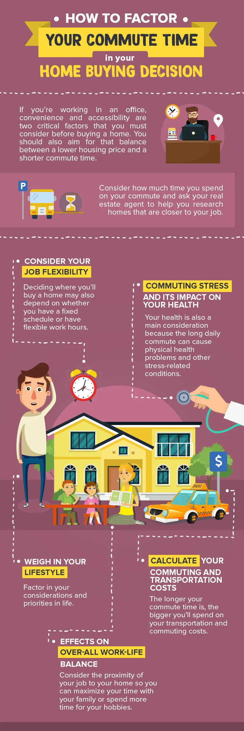 Before deciding where you want to live, factor your commute into your home buying process. While doing your house-hunting, it would be best to ask your real estate agent to do some research on homes that are closer to your job. Your realtor will help you weigh the pros and cons that can help you make an informed decision on what would be the best home — and commute — for you.