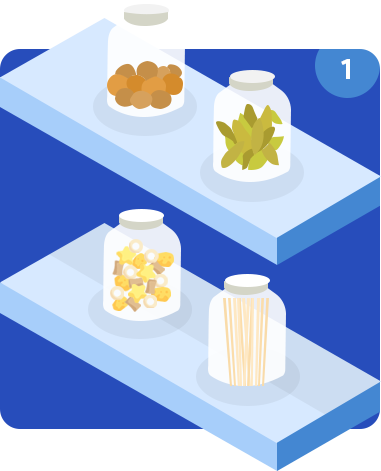 Just choose the essential items to transfer into large, clear containers, such as rice or pasta, so you can better keep stock of your inventory. Other items, such as snack foods, are better left in their original packaging to be arranged in baskets. Just eliminate their outer box to save more room in your storage.